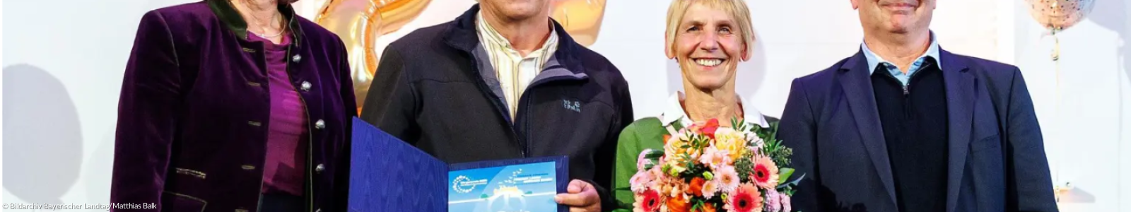Bild: Landtagspräsidentin Ilse Aigner (links) überreichte die Auszeichnung. Lothar Schmidt, Camilla Ebert und Thomas Glück (von rechts) nahmen sie stellvertretend für das Organisationsteam entgegen. (Foto: Bildarchiv Bayerischer Landtag/Matthias Balk)