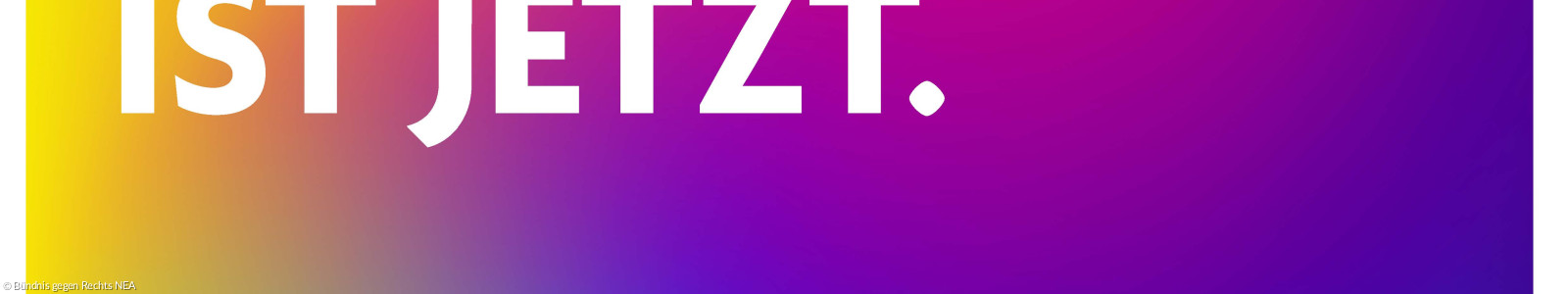 Schriftzug "Nie wieder ist jetzt" auf Regenbogenfarbenhintergrund